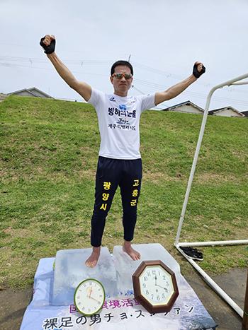 광양시 홍보대사 ‘맨발의 사나이’ 조승환 씨가 25일 일본 오사카시에서 또 한 번 자신의 ‘얼음 위 맨발로 서 있기’ 세계신기록을 깼다.