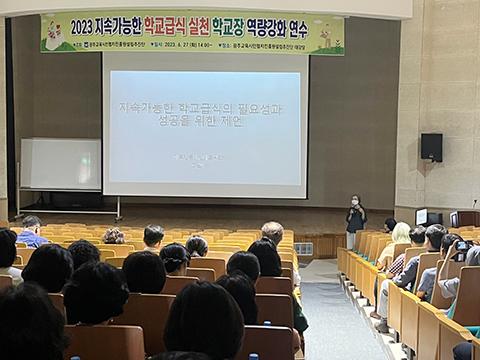 광주교육시민협치진흥원설립추진단이 지난 27일 대강당에서 ‘2023 지속가능한 학교급식 실천 학교장 역량 강화’ 연수를 개최했다.