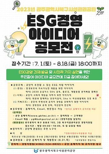 광주시북구시설관리공단은 주민 소통·참여와 ESG경영과제 발굴을 위해 7월 1일부터 8월 18일까지 ‘2023년 ESG경영 주민 참여 아이디어 공모전’을 개최한다.