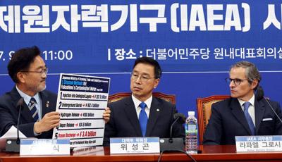 더불어민주당은 9일 오전 라파엘 그로시 국제원자력기구(IAEA) 사무총장과 만나 면담했다. 그로시 사무총장은 우려를 이해한다면서도 일본 후쿠시마 현지에 방류 안전성 검토를 위해 IAEA가 수년 내지 수십년 동안 상주할 것이라고 말했다. 이에 비해 민주당은 일본 후쿠시마 핵오염수 해양 방류 연기와 타 대안 검토를 제언했다.
