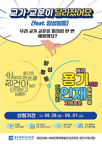 이정선 교육감은 “‘교가·교훈 새로 만들기’로 교가·교훈의 성차별적 표현과 성역할에 대한 고정관념이 줄었으면 한다”며 “이번 공모로 우수한 사례가 많이 발굴되길 기대한다”고 말했다.