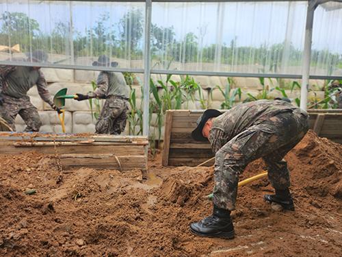 부대원들은 중장비가 투입되기 힘든 지역에서 농수로 토사제거, 유실된 법면 등의 수해복구 작업을 하며 구슬땀을 흘렸다.