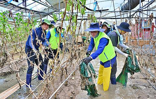 이날 봉사단은 콩밭 제초 작업과 침수 피해를 입은 시설하우스 내 작물 제거 작업 및 주변 정리작업으로 값진 땀을 흘렸다.