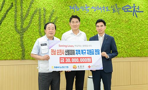 NH농협은행은 지난 4월 순천시 송광면에서 발생한 대규모 산불 피해 복구를 위해 써 달라며 3천만 원의 지정기탁금을 지난 8일 대한적십자사 광주전남지사를 통해 순천시에 전달했다.