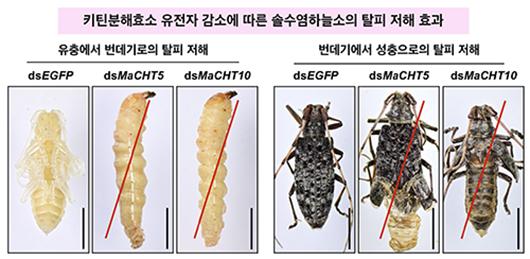 키틴분해효소가 감소됨에 따라 유충이 번데기로, 번데기가 성충으로 탈피하지 못하고 100% 치사하는 것이 확인됐다.
