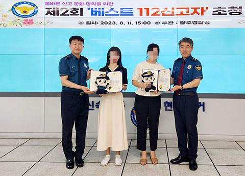 광주경찰청은 11일 제2회 베스트 112 신고자 초청 행사를 열어 범인 검거에 기여한 구모(39·여)씨 등 시민 2명에게 감사장을 전달했다.