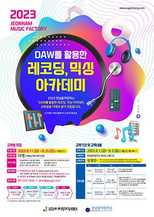 강진에 있는 전남음악창작소는 지역음악 인재 양성과 창작 역량 강화를 위해 ‘2023 DAW를 활용한 레코딩 · 믹싱 아카데미’ 교육생을 모집한다고 16일 밝혔다.