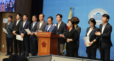 국회 행정안전위원회 더불어민주당 간사인 강병원 의원 등 야당의원들이 16일 오전 서울 여의도 국회 소통관에서 행안위 파행과 관련해 기자회견을 하고 있다.