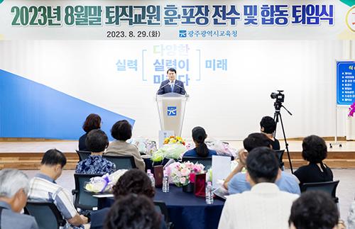광주시교육청이 29일 시교육청 대회의실에서 8월말 정년퇴직과 내년 2월 명예퇴직 교원을 대상으로 ‘2023년 8월말 퇴직교원 훈·포장 전수 및 합동 퇴임식’을 개최했다.