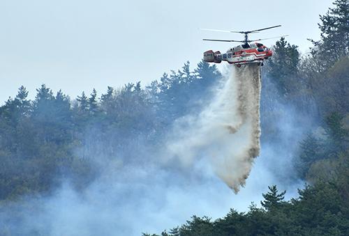 4일 오후 전남 함평군 대동면 연암리 한 야산에서 헬기가 전날 발생한 야산 불을 끄기 위해 진화 작업을 하고 있다. 2023.04.04