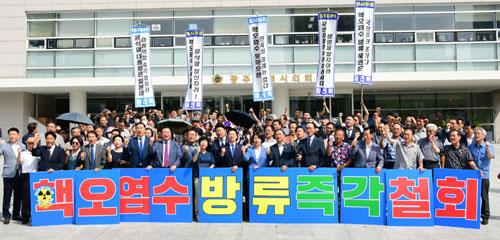 /정진욱 더불어민주당 이재명 당대표 정무특별보좌역이 4일 오전 광주시의회 앞에서 지지자들과 함께 \'일본 후쿠시마 핵오염수 해양투기 즉각 철회\'를 촉구하는 투쟁선언식을 열고 있다. /정진욱 특보 측 제공