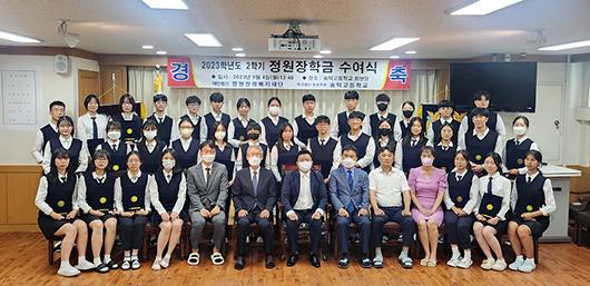 학교법인 청송학원 김용만 이사장이 지난 4일 정원장학복지재단을 통해 숭덕고에 2학기 ‘정원 장학금’ 총 3500만 원을 전달했다.