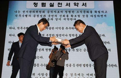 노태악 중앙선거관리위원장이 11일 경기 과천 중앙선관위 대강당에서 열린 청렴 실천 서약식에서 김용빈 사무총장으로부터 전 직원의 서명이 담긴 청렴 실천 서약서를 건네 받고 있다.