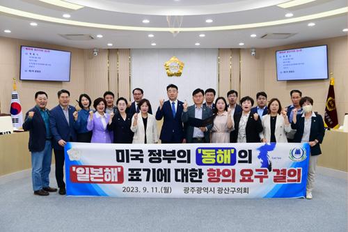 광산구의회는 11일 제282회 임시회 제1차 본회의를 열어 공병철 더불어민주당 구의원(신흥동·우산동·월곡1·2동·운남동)이 대표발의한 \'동해(East Sea)의 일본해(Sea of Japan) 표기 항의 요구 결의안\'을 채택했다.