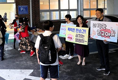 학부모들은 출근 혹은 등교 중인 교사와 학생들에게 에너지바, 음료수를 건네며 응원의 메시지를 전달했다. 또한 피켓을 통해 학교폭력 및 흡연예방 캠페인도 함께 진행하며 학교 구성원들의 건강하고 안전한 학교생활을 기원했다.