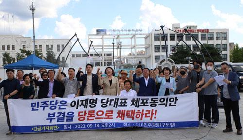 친명계 원외모임인 \'더민주 광주혁신회의\'도 이날 광주시의회에서 기자회견을 열고 이 대표에 대한 정치적 탄압 중단과 체포동의안 부결, 정치검사 척결, 윤석열 정권 퇴진, 내각 총사퇴 등 5대 요구안을 제기했다.