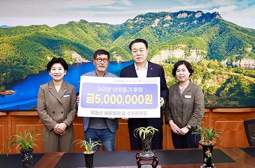 \'무등산바우정원 & 수만리커피\'는 코로나19가 기승을 부리던 지난 2020년 500만원 상당의 방역물품을 기부했고 2021년에도 화순읍 수만리 마을 경로당에 에어컨, 냉장고 등 가전제품 구매비 500만원을 기부했다.