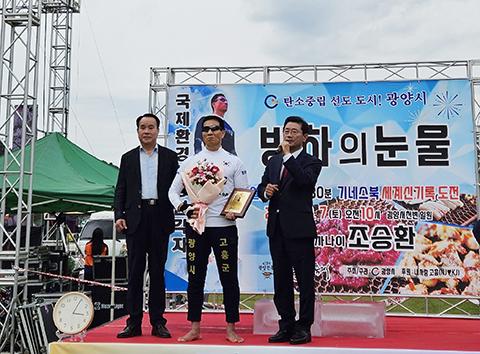 세계적인 국제환경운동가이자 광양시 홍보대사로 활동 중인 맨발의 사나이 조승환이 얼음 위 맨발로 오래 서 있기 4시간 30분을 성공하며 또다시 세계 신기록을 경신했다.