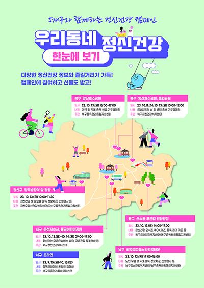 광주시는 9일부터 20일까지를 정신건강주간으로 정하고 ▲1010 걷기 챌린지 ▲만족도 조사 이벤트 ▲정신질환 인식개선 퀴즈풀이 등 기념이벤트를 펼친다. 또 5개 자치구별로 ‘우리동네 정신건강 캠페인’을 진행, 정신건강 정보와 함께 정신건강 상담 및 선별검사, 마음안심버스 운영 등 다양한 체험거리를 제공한다.
