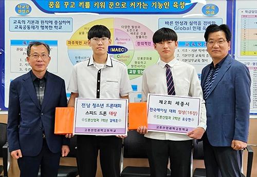 고흥산업과학고 드론산업과 1학년 김태훈군이 \'2023 전남청소년 드론대회\' 스피드 드론분야 대상, 2학년 유승현군이 드론대회 중 가장 난이도가 높은 제2회 전국 드론레이싱 아날로그 분야에 첫 출전해 어려운 관문을 뚷고 16강에 진출하는 성과를 올렸다고 밝혔다.