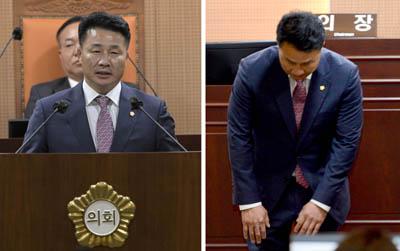 광주 북구의회는 18일 제289회 임시회를 열어 윤리특별위원회가 상정한 기대서 의원에 대한 출석정지 30일·공개 사과를 내용으로 하는 징계안을 의결했다. 기 의원은 수의계약 비위와 관련해 1·2심 모두 벌금형을 선고 받았다. 징계안 의결 직후 기 의원이 고개 숙여 사과하고 있다.