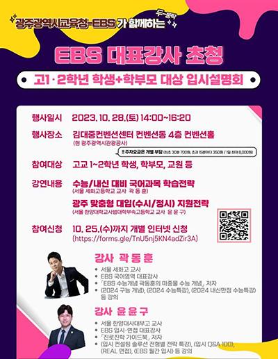 광주시교육청이 오는 28일 14시 김대중컨벤션센터 컨벤션홀에서 ‘EBS 대표강사 초청 고1·2학년 학생 및 학부모 대상 입시설명회’를 개최한다.