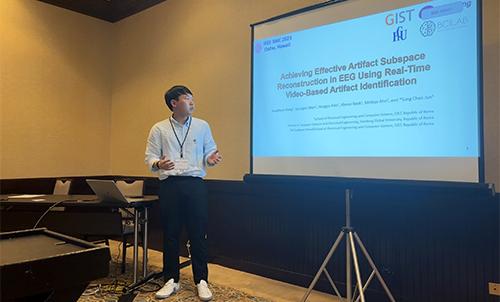 강성현 지스트 석사과정생이 \'IEEE SMC 2023\'의 \'두뇌-머신 인터페이스(BMI) 시스템 부문\'에 참가해 실시간 비전 정보를 활용한 뇌파의 비정상 잡음 식별 및 제거 기술을 제시하는 내용의 논문을 발표했다.
