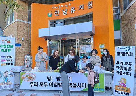 진남유치원에 따르면 이번 캠페인은 한창 성장하는 시기의 유아들이 아침밥을 먹고 집중력을 키우며 건강한 습관을 기를 수 있도록 마련됐다. 이날 진남유치원은 채소가득 주먹밥과 따뜻한 선식을 새벽부터 준비해 유아들에게 아침밥으로 제공했다. 아침을 거르고 출근하는 학부모들을 위한 쌀떡도 준비됐다.