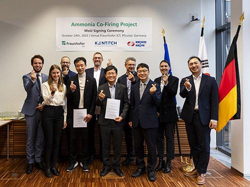 한국에너지공대(KENTECH)가 지난 24일 독일 프라운호퍼 ICT (Institut fur Chemische Technologie) 연구소에서 ‘암모니아 혼소 발전 안전 분야’ 기술의 국제 공동 연구 개발을 위해 프라운호퍼 ICT 연구소 (독일), 한전 전력연구원과 업무협약을 체결했다. /한국에너지공대 제공