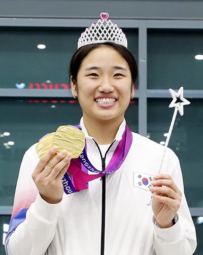 2022 항저우 아시안게임 대한민국 배드민턴 대표팀 안세영 선수가 8일 인천국제공항 제1여객터미널 입국장 앞에서 성지현 국가대표팀 코치에게 왕관을 받고 기념촬영을 하고 있다. 2023.10.08