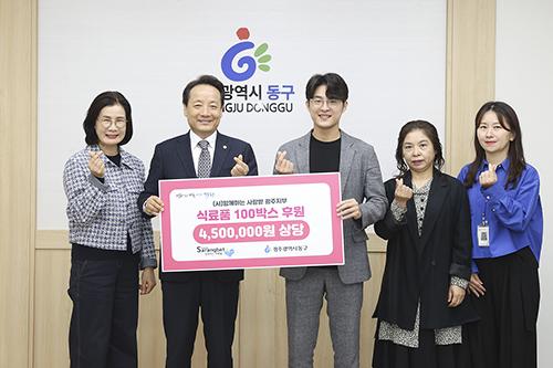 광주 동구는 27일 ‘(사)함께하는 사랑밭’ 광주지부에서 돌봄이웃을 위한 식료품 세트 100박스(450만 원 상당)를 기탁했다고 밝혔다.
