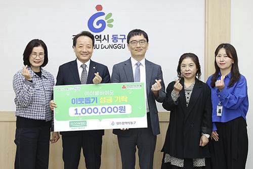 광주 동구는 ㈜이룸바이오에서 저소득층 지원을 위한 이웃 사랑 나눔 실천으로 후원금 100만 원을 기탁했다고 밝혔다.