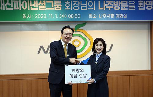 전라남도 나주시는 전날 시청사 이화실에서 대신파이낸셜그룹과 사랑의 성금 전달식을 가졌다고 2일 밝혔다.