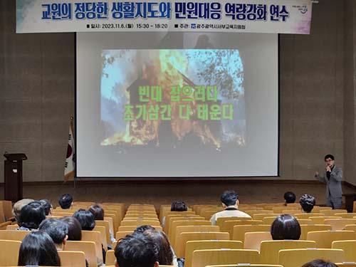 광주서부교육지원청이 지난 6일 관내 교원을 대상으로 ‘정당한 생활지도 이해와 민원 대응 역량 강화’ 특강을 실시했다.
