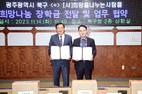 15일 북구에 따르면 지난 14일 북구청 상황실에서 문인 북구청장, 김동우 희망을나누는사람들 부회장 등 관계자들이 참여한 가운데 ‘희망 나눔 장학금 후원을 위한 업무협약’이 체결됐다.