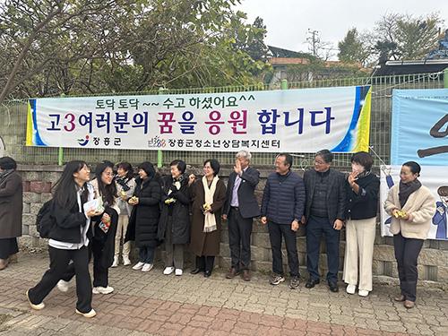 장흥군청소년상담복지센터는 16일 대학수학능력시험을 치르는 수험생들을 대상으로 장흥고등학교 정문에서 수능 응원 아웃리치를 진행했다.