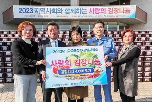 광양시는 포스코 광양제철소가 지난 20일 전남사회복지공동모금회에 6000만원을 기탁하고 광양YWCA와 협력해 지역사회와 함께하는 사랑의 김장나눔을 통해 김치 4000포기(900통)를 지역 내 취약계층 514가구와 복지시설 36개소에 전달했다고 밝혔다.