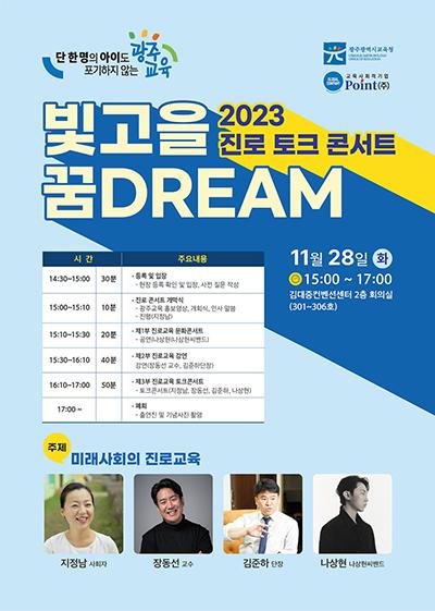 광주시교육청이 오는 28일 오후 3시 김대중컨벤션센터 2층 강당에서 ‘제2차 진로 토크 콘서트 빛고을 꿈(DREAM)’을 개최한다.