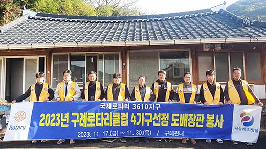 국제로타리 3610지구 구례클럽은 올해에도 따뜻하고 훈훈한 겨울나기를 지낼 수 있도록 관내 어려운 저소득 가정 3가구(총 1200만 원 상당)를 대상으로 도배·장판 봉사활동을 펼쳤다고 밝혔다.