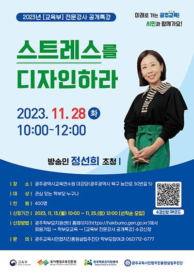 광주교육시민협치진흥원설립추진단(이하 추진단)이 오는 28일 방송인 정선희를 초청해 광주교육연수원 대강당에서 학부모·시민 대상 공개특강을 실시한다.