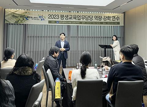 광주시교육청이 지난 21일 동·서부 교육지원청 비영리(공익)법인 및 학원 업무 담당자 35명 대상으로 내년부터 시행되는 학원 시설 기준 변경 등에 대비하기 위한 직무연수를 실시했다.