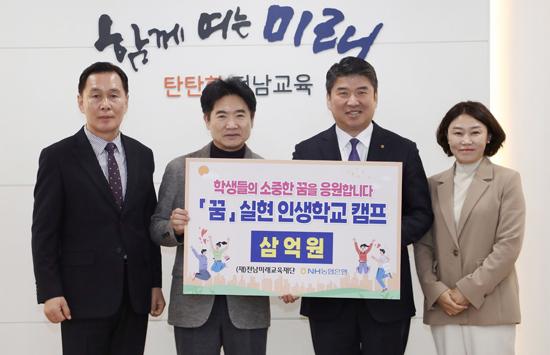 전남미래교육재단이 지난 27일 NH농협은행 전남본부로부터 3억 원의 특별한 ‘장학기금’을 전달받아 ‘꿈 실현금’과 ‘꿈 실현 인생학교’라는 새로운 형태의 장학사업을 시작한다.