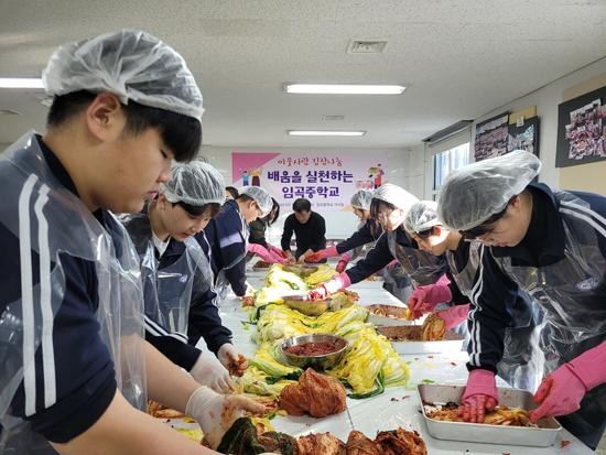 임곡중에 따르면 교직원과 학생이 직접 김치를 담가 도움이 필요한 이웃에 기부하는 ‘이웃사랑 김장 나눔’ 행사는 2017년부터 올해로 7년째 이어지고 있다. 이번에 김장한 김치는 임곡동 행정복지센터를 통해 지역에서 홀로 사는 어르신, 기초생활수급자, 차상위계층 등에 전달될 예정이다.