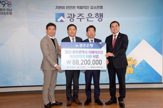 광주은행은 29일 은행 본점에서 고병일 광주은행장과 문영훈 광주시 행정부시장, 김대삼 광주시 사회서비스원장, 김동기 광주 아너 소사이어티 대표가 참석한 가운데 ‘광주 지역 치매 어르신 대상 배회감지기 지원사업’ 후원금 전달식을 가졌다고 밝혔다.