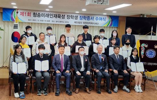 학교법인 청송학원 숭덕고등학교와 재단법인 정원장학복지재단 김용만 이사장이 지난 8일 광주 시내 중학생 15명에게 청송 미래 인재 육성 장학금 1500만 원을 지급했다. 청송 미래 인재 육성 장학금은 실력 우수 부문 8명에게 800만 원, 복지 부문 6명에게 600만 원, 효행 부문 1명에게 100만 원이다.