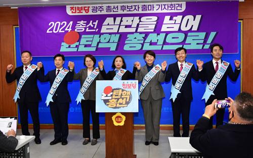 진보당 광주 지역 총선 출마자들이 12일 \"내년 총선은 정권 심판을 넘어 윤석열 탄핵으로 가는 선거가 돼야 하고, 이를 위해 반(反) 윤석열 야권 연대와 총단결이 필요하다\"고 밝혔다.