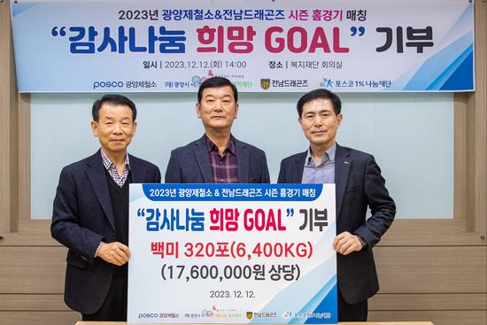 ‘감사나눔 희망 Goal’ 쌀 전달식은 광양제철소와 전남드래곤즈가 지역사회로부터 받은 사랑에 보답하고 이웃들에게 더불어 함께 살아가는 따뜻한 희망을 전하겠다는 취지로 광양시사랑나눔복지재단과 MOU를 채결해 2012년부터 이어오고 있는 행사다.