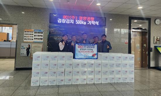 ㈜OCI 광양공장이 연말을 맞이해 태인동에서 지역사회 환원사업의 일환으로 김장김치 100박스(500kg)를 광양시 사랑나눔복지재단(이사장 김재경)을 통해 태인동사무소에 지정 기탁했다고 14일 밝혔다.