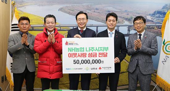 NH농협나주시지부가 연말연시를 맞아 저소득층 이웃을 위한 성금 5000만원을 쾌척했다.