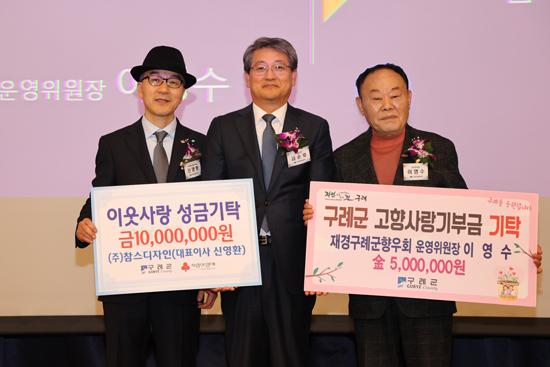 기부에 참여한 인사는 재경구례군향우회 이영수 운영위원장과 ㈜참스디자인 신영환 대표이사로 고향사랑기부금 최고액인 500만 원과 이웃돕기 성금 1000만 원을 기탁했다.